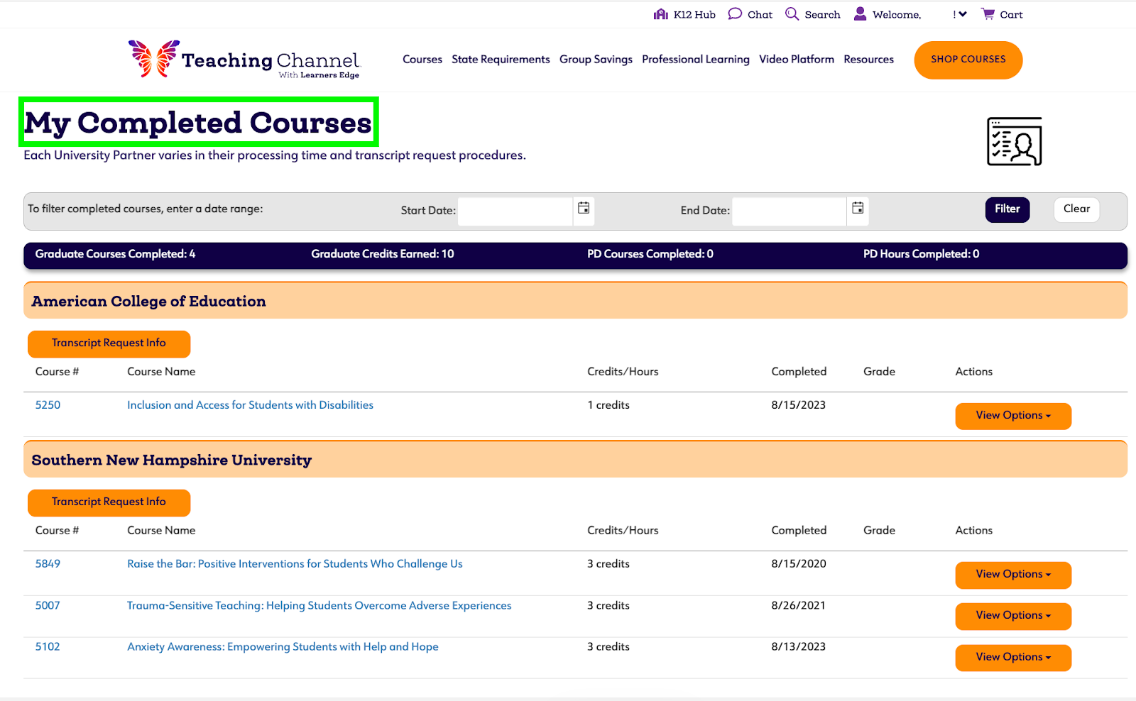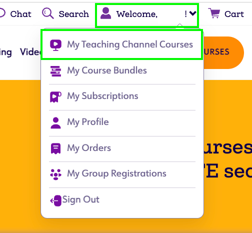 - Once logged in, click on Welcome, Your Name! Then select My Teaching Channel Courses in the drop down menu